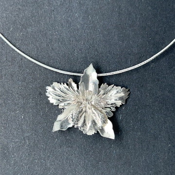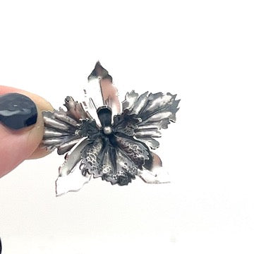 Immerse yourself in the intricate beauty of this hand-raised corsage orchid, a showcase of the ancient French chasing and repoussé techniques. Each piece is a labor of love, beginning with a hand-drawn design that is then meticulously cut and then the forming begins. Pattie's mastery of repoussé involves hammering and shaping the metal from both the front and back, creating a stunningly realistic three-dimensional flower. This demanding process results in a corsage orchid that captures the delicate essence of a real orchid, with depth and texture that are truly captivating.