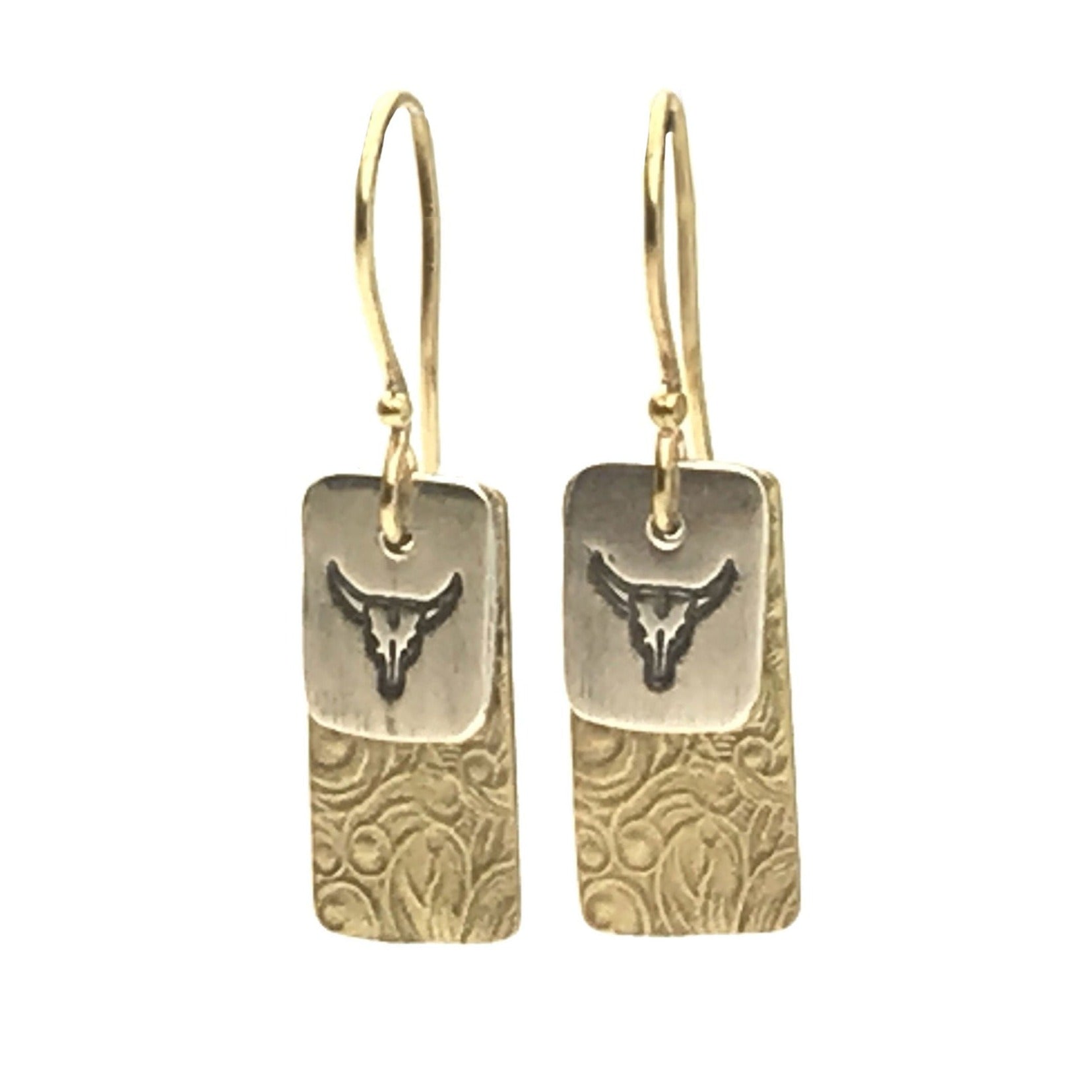 These double charm earrings are a perfect blend of classic elegance and Western charm. The earwires are sterling silver front features a cute stamped longhorn skull in sterling silver, while the back plate is adorned with a beautiful brass art nuvo pattern. These earrings are sure to add a touch of personality to any outfit.