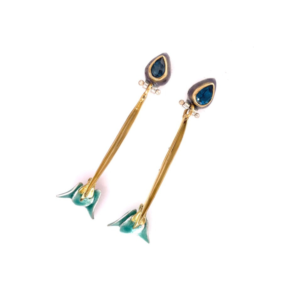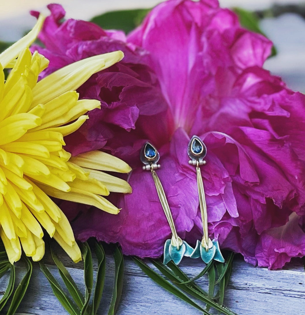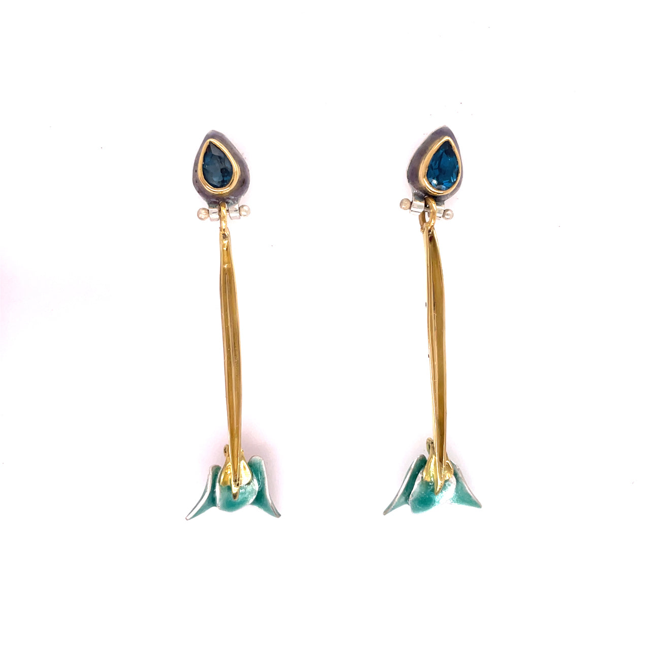 These exquisite earrings feature handmade enamel petals with stunning Blue Topaz stones. The design features a delicate petal shape with intricate details and a glossy finish. The Blue Topaz stones are carefully selected for their quality and beauty, and are set in a secure prong setting. The combination of the Blue Topaz stones and the enamel petals creates a stunning, eye-catching look that will add a touch of elegance to any outfit.