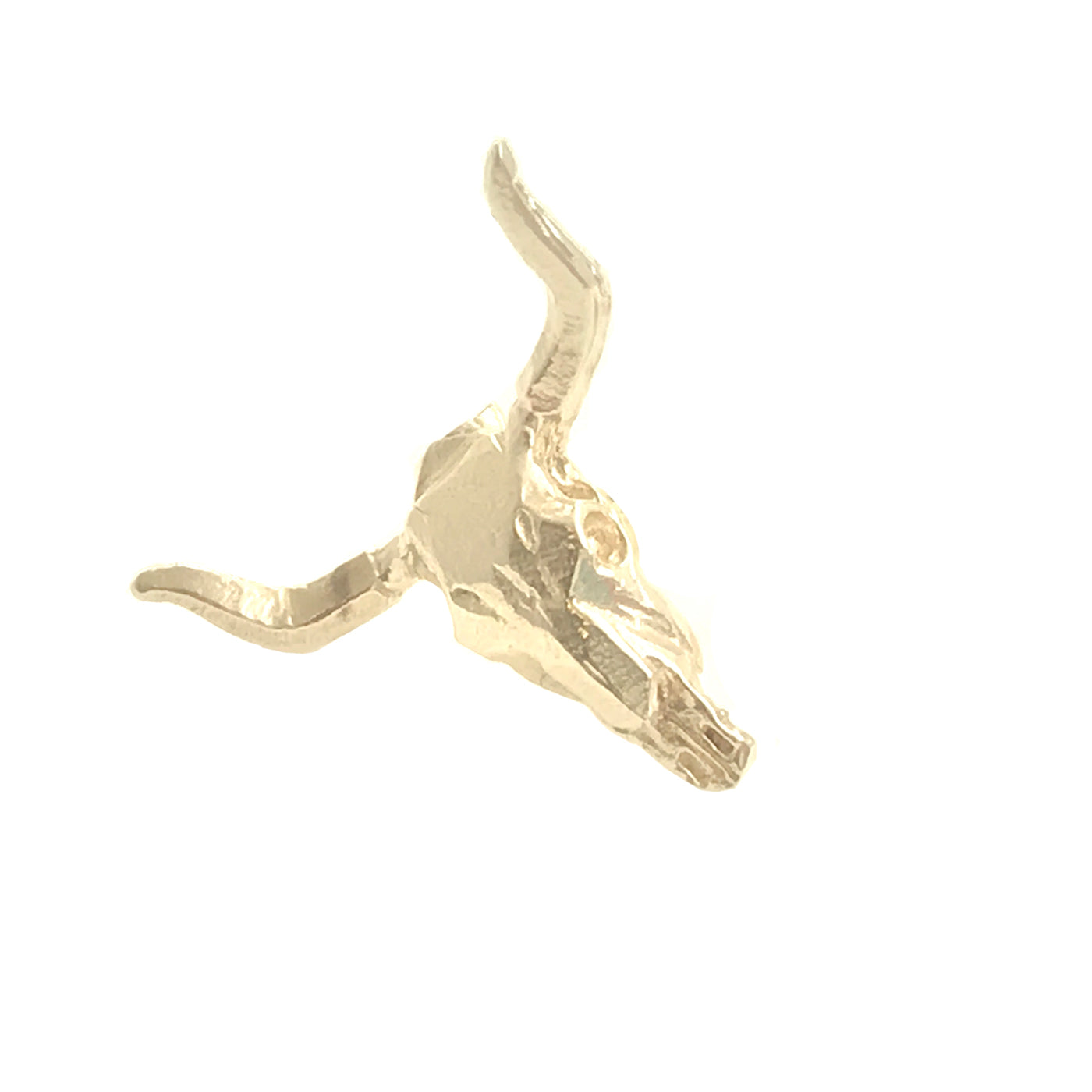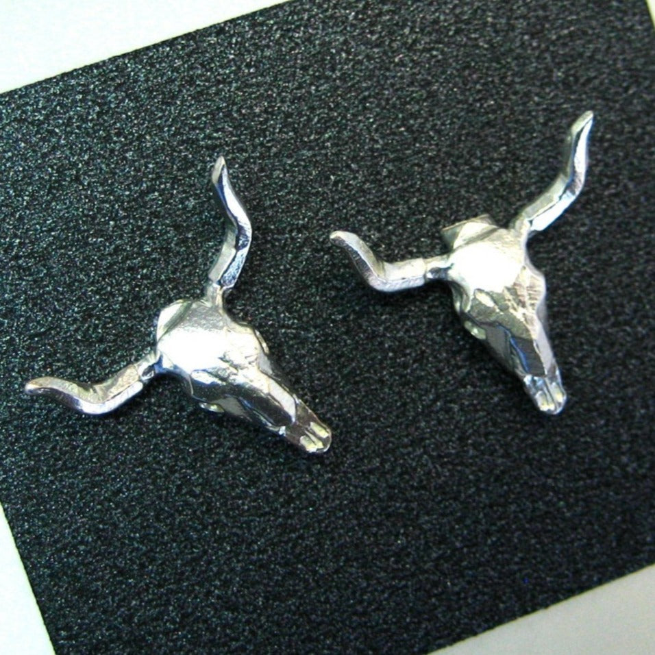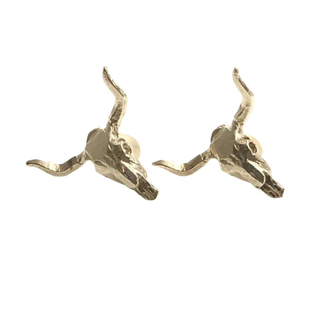 Longhorn Skull Stud Earrings: Add a touch of Western flair to your jewelry collection with these striking longhorn skull stud earrings. Available in multiple high-quality finishes, including classic sterling silver, warm brass (with hypoallergenic sterling silver posts), radiant 22k gold plated, and luxurious 14k solid gold. These detailed skull earrings are perfect for everyday wear or a unique statement piece. Shop now for longhorn jewelry, Western earrings, skull stud earrings, and gold longhorn earrings. Find your perfect pair today!