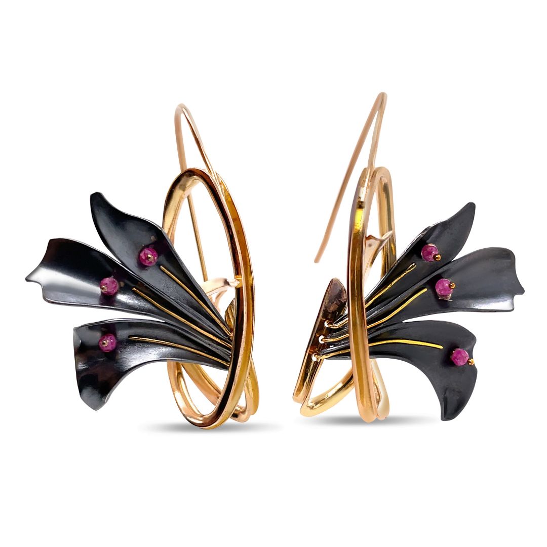These striking statement earrings are the perfect pair for those special events. These one of a kind Mangolia Flower Petals inspired earrings will add the perfect touch of elegance to your outfit. They are hand raised with the anticlastic technique and feature argentium silver in the petals, 14k gold stems and rubies within the flower's petals. They are lightweight for comfort but still bring elegance to any evening.