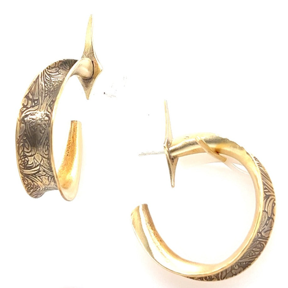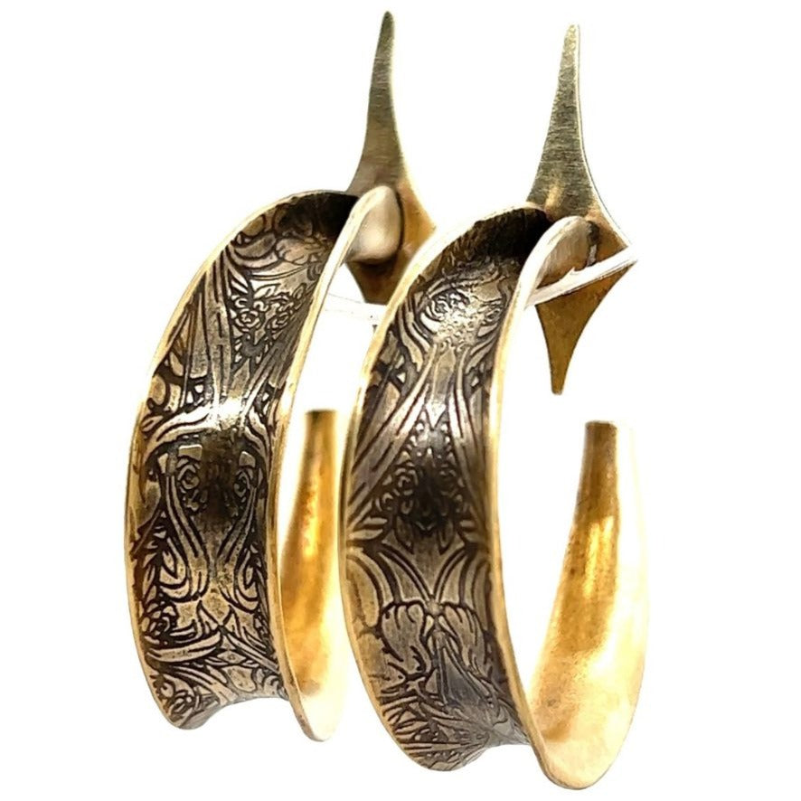 Unveil the captivating union of art and innovation with the Art Nouveau Grande Hoops. These mesmerizing earrings, have a genuine art nouveau era pattern in the inside, with flowing floral patterns. Then these hoops go to the next level crafted using the anticlastic raising technique, transcend ordinary hoops with their sculptural 3D form that gives the look of big vibrant sculptural hoops but are light weight.