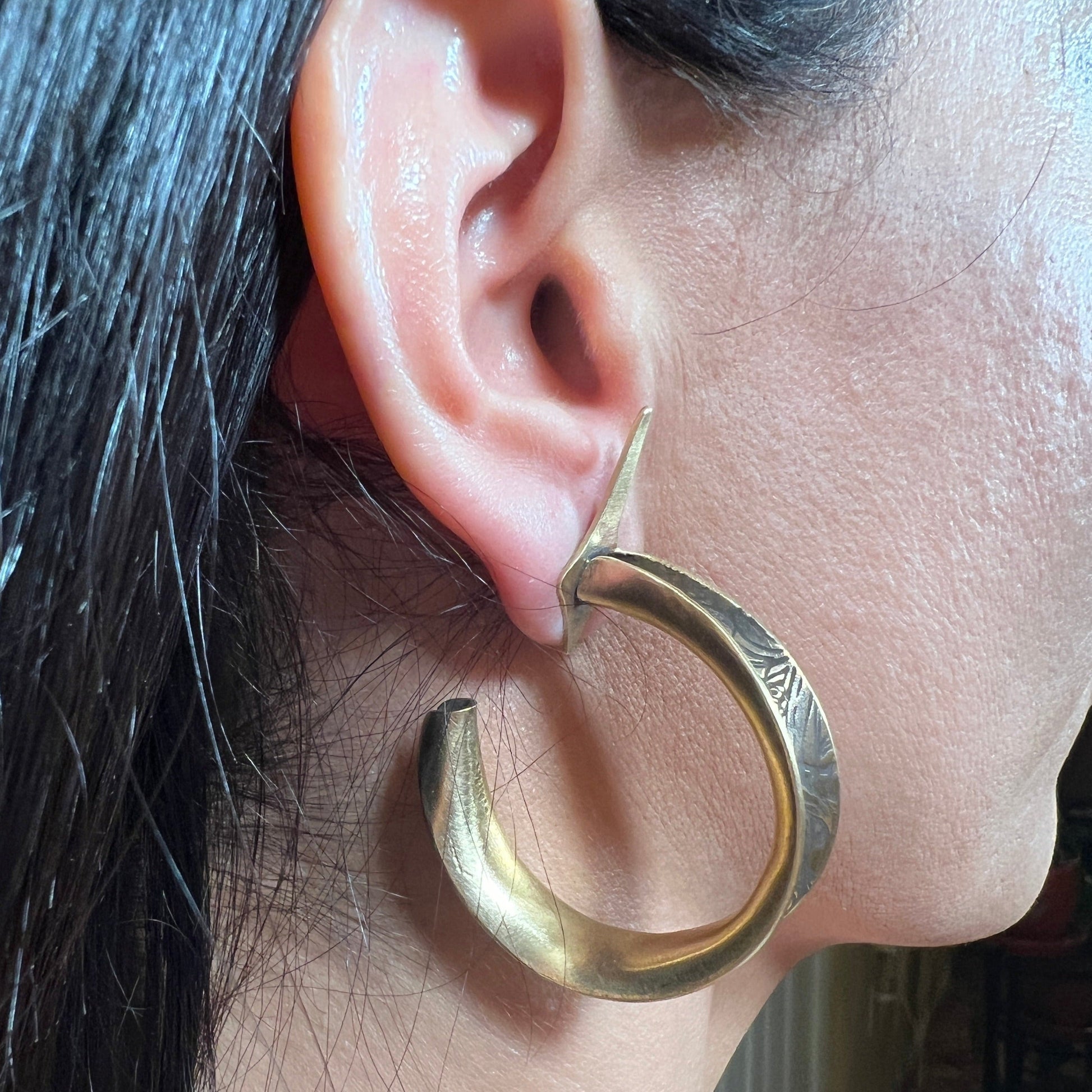 Keywords: Art Nouveau earrings, Hoop earrings, Large earrings, Embossed earrings, Handcrafted earrings, Silver earrings, Brass earrings, Gold-plated earrings, High polish, Black patina, Matte finish, Gift earrings, Statement earrings, Bold earrings, Timeless earrings, Sculptural earrings,