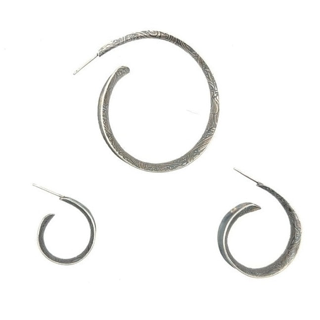 Unveil the captivating union of art and innovation with the Art Nouveau Grande Hoops. These mesmerizing earrings, have a genuine art nouveau era pattern in the inside, with flowing floral patterns. Then these hoops go to the next level crafted using the anticlastic raising technique, transcend ordinary hoops with their sculptural 3D form that gives the look of big vibrant sculptural hoops but are light weight.