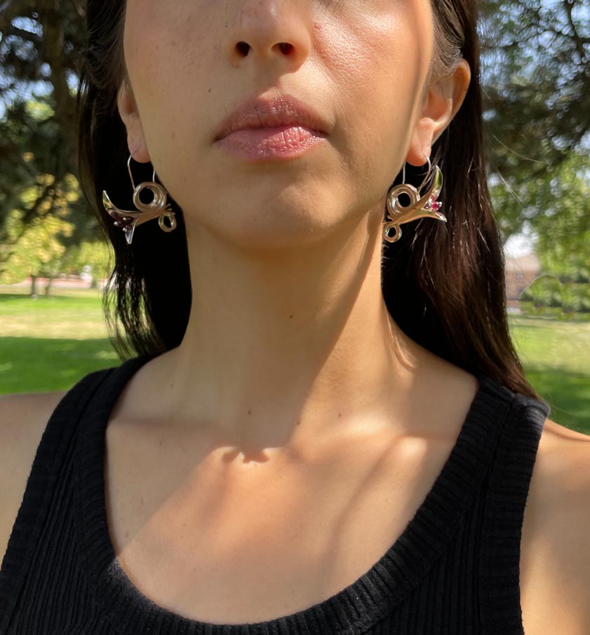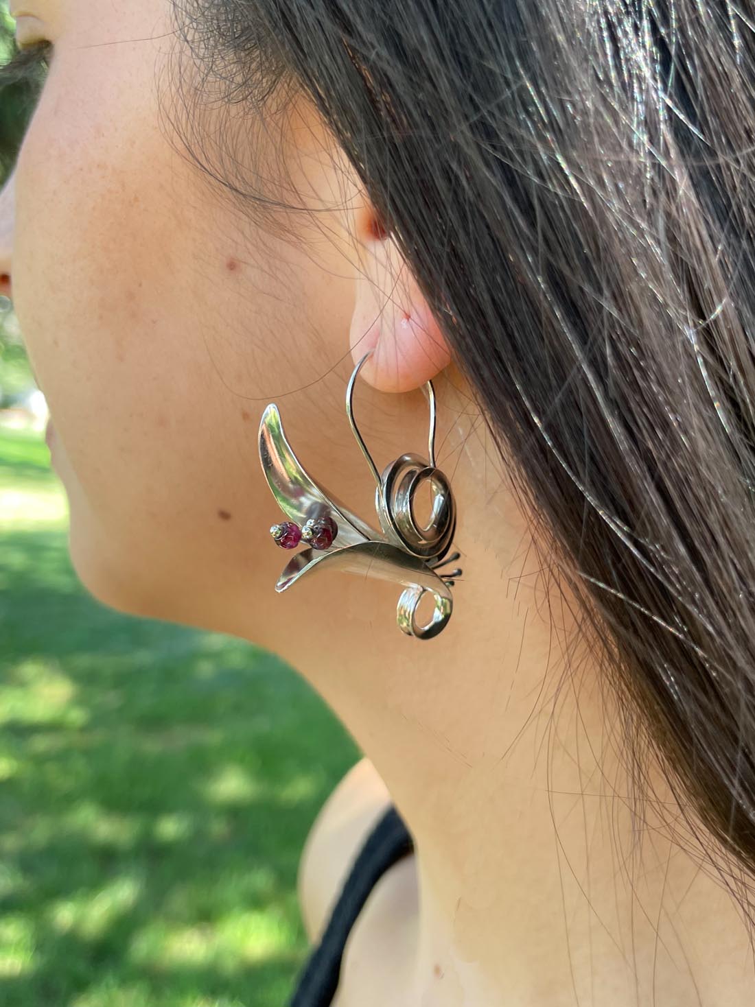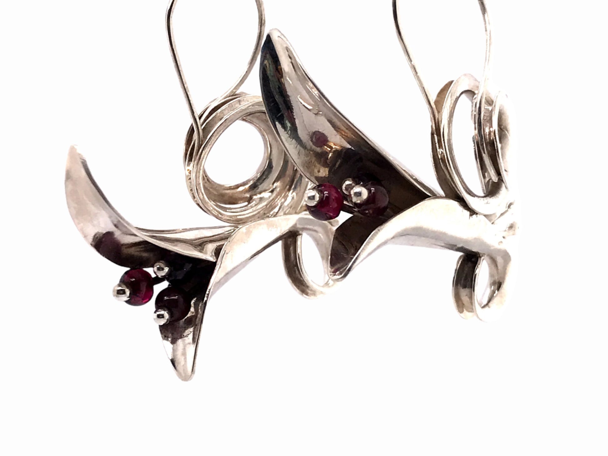 These stunning handmade earrings are inspired by the Art Nouveau period and feature intricate trumpet-shaped designs. Each form is hand raised using hundreds of blows with a hammer which creates a unique, one of a kind three-dimensional shape that is actually light weight, but looks much heavier. These earrings are adorned with a natural garnet stone, adding a pop of deep red to the elegant silver setting. These statement earrings are perfect for anyone looking for a unique and eye-catching accessory that is sure to turn heads.